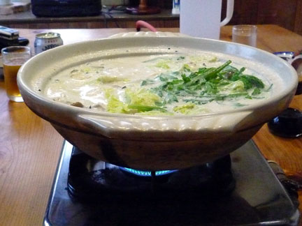 食事は牛乳鍋。オーナーの指示に従って具材を鍋に入れていく。われわれは一人旅のテーブルで、JRで来た男性2人とクルマで来た鹿追の女性(美女)、そしてライダーが二人。